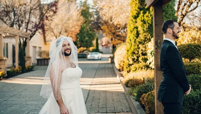 Në momentin që i kërkoi 32-vjeçarit të kthente kokën, ai nuk po mund të ndalonte së qeshuri, kur pa shokun e tij me mjekër, që kishte veshur fustanin e nusërisë, bashkë me vello.