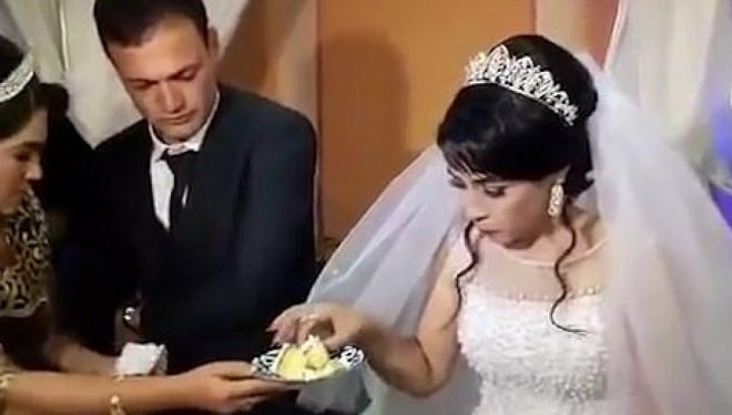 Pamjet, sipas mediave të huaja, përcjell Telegrafi, besohet se janë bërë në Azinë Qendrore, dhe tregojnë se dhëndri godet me zemërim nusen e tij pasi ajo e ngacmonte duke pretenduar se po i ofronte një pjesë të tortës së dasmës.