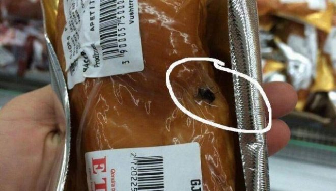 Një konsumator i ka dërguar mediave online foto ku shihet mishi i bardhë i pulës i tymosur, ku brenda gjendet edhe një insekt që duket të jetë mizë.