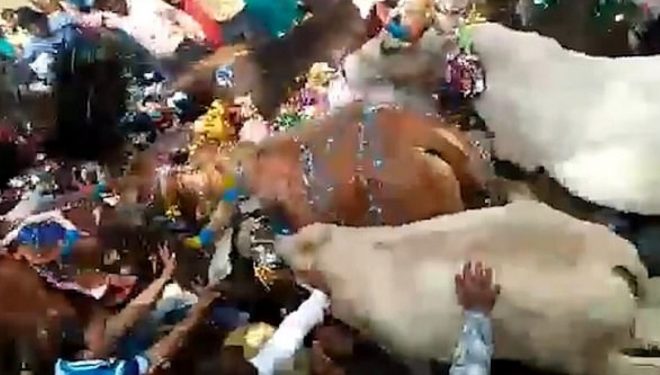 Turma e njerëzve që ishin mbledhur për të parë këtë ngjarje, shihen se si i bashkohen vullnetarëve duke u shtrirë në tokë që të shtypën nga lopët.