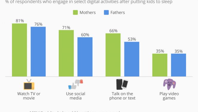 Sapo fëmijët të flenë, shumica e prindërve ulen për tu relaksuar dhe disa prej tyre madje përdorin pajisjet elektronike. Pjesa më e madhe e prindërve shohin televizor ose filma sipas një ankete realizuar nga Universiteti Brigham në Shtetet e Bashkuara.