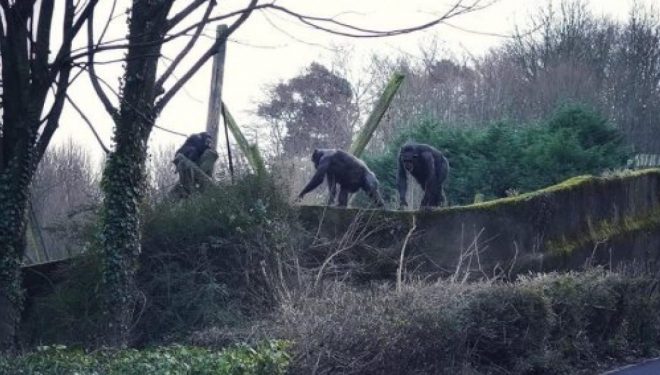 Vizitorët shikonin të habitur, derisa një grup majmunësh po iknin prej kafazeve të tyre në kopshtin zoologjik në Belfast të Irlandës.