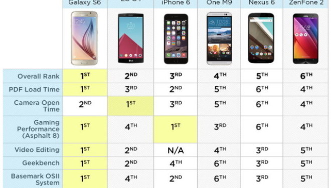 Gara u zhvillua mes Samsung Galaxy S6, LG G4, Apple iPhone 6, HTC One M9, Google Nexus 6 dhe Asus Zenfone 2. Telefonat janë përdorur për të hapur një skedar PDF, për të hapur kamerën, për të luajtur lojën Asphalt 8 etj. Në pjesën më të madhe të testeve, Galaxy S6 rezultoi më i miri. Vetëm në testin “3DMark Ice Storm Unlimited” telefoni u rëndit në vend të tretë, duke u mundur nga HTC One M9 dhe Nexus 6.