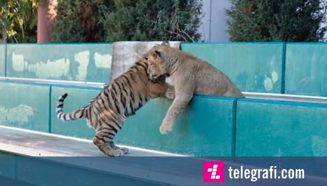 Këlyshi katër muajsh i tigrit dhe luanesha që ka katër muaj e gjysmë, që jetojnë në kopshtin zoologjik në Sochi të Rusisë, janë bërë miq të pandashëm.