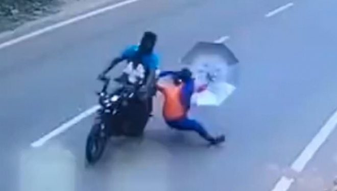 Një grua që po udhëtonte me motoçikletë duket se nuk i kishte bërë mirë matjet kur vendosi ta hapë ombrellën – veprim ky që i kushtoi shtrenjtë, ajo u rrëzua në tokë pasi ombrella i shërbeu si parashutë që e ndalë ajrin.