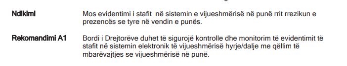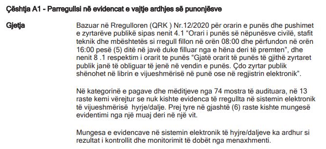 “Ne kategorinë e pagave dhe mëditjeve nga 74 mostra te audituara, ne 13 raste kemi vërejtur se nuk kishte evidenca te rregullta ne sistemin elektronik te vijueshmërisë hyrje/dalje. Prej tyre ne gjashte (6) raste kishte mungese evidentimi nga nja muaj deri ne një vit”.