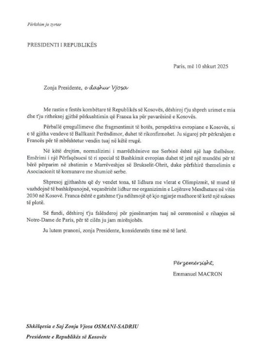 “Franca mbetet një aleate e përkushtuar e Kosovës dhe do të vazhdojë ta mbështesë stabilitetin, zhvillimin dhe perspektivën evropiane të saj.” – ka shkruar ndër të tjera në urimin e tij, Macron.