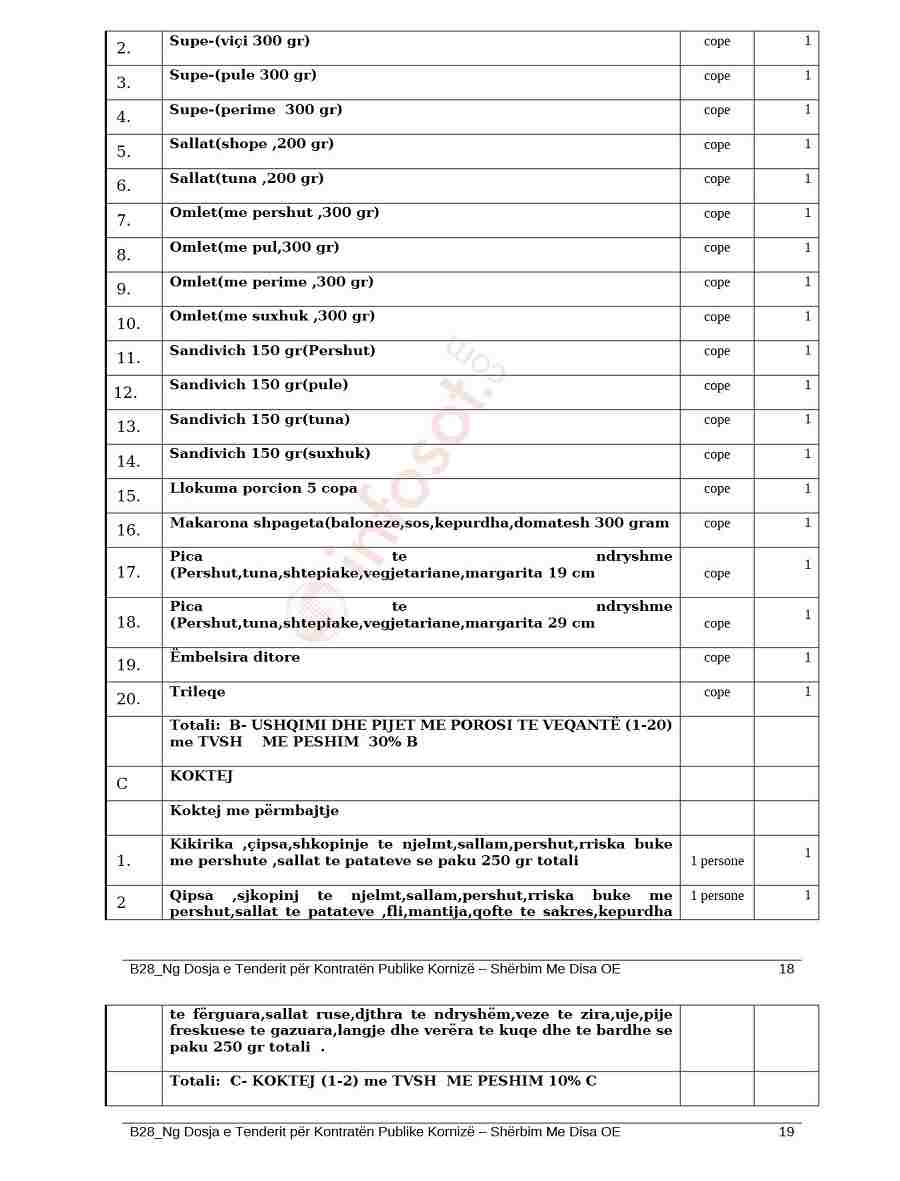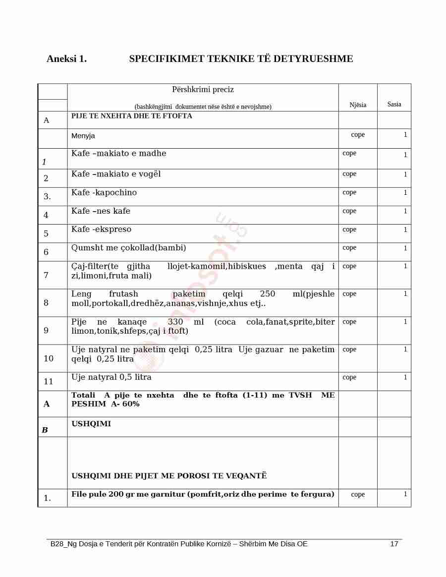 Në listën e specifikimeve të tenderit, shteti kërkon file pule me garniturë (pomfrit, oriz dhe perime të fërguara), omleta me suxhuk, përshutë apo pulë, pica të ndryshme 19 dhe 29 cm, për dezert trileqe e ëmbëlsira ditore, verë të kuqe e të bardhë dhe sigurisht “snack-time”, kikirika, sallam, sallatë ruse, fli e mantija.
