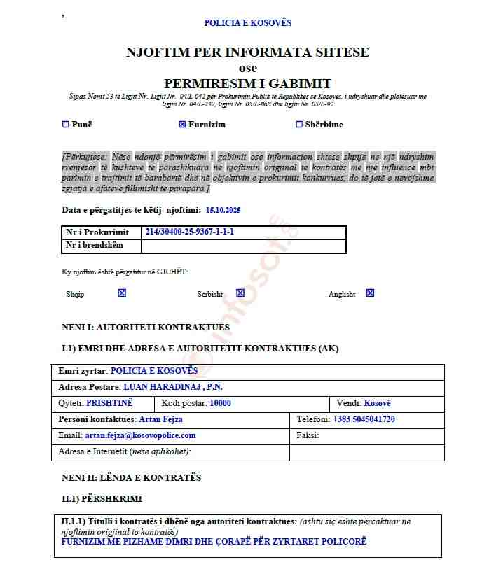 Policia e Kosoves, Njoftim per tender (Dokument)