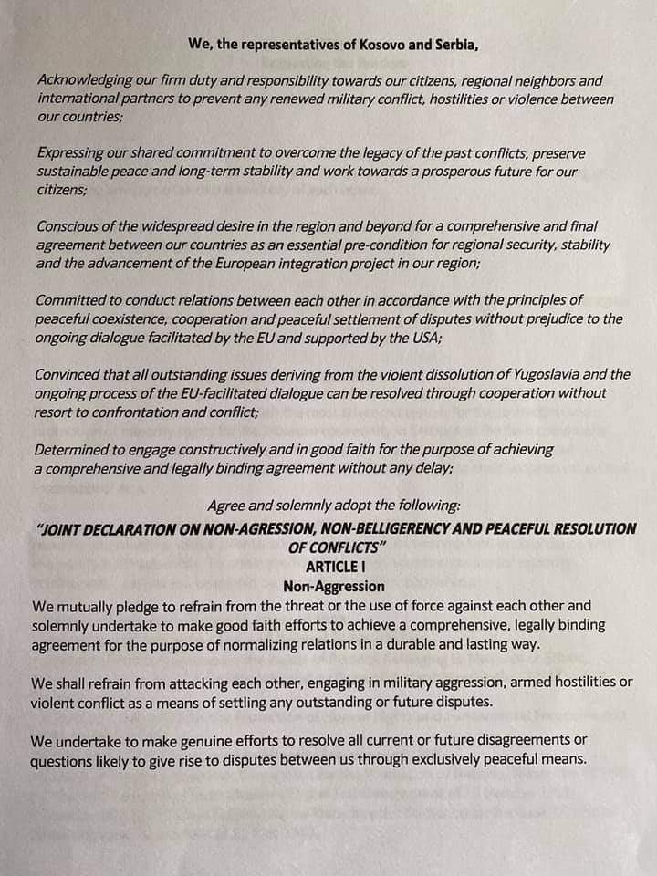 Kryeministri i Kosovës, Albin Kurti, ka publikuar dokumentin e quajtur “Deklarata e Paqes” prej gjashtë nenesh, e cila iu propozua si formë marrëveshjeje presidentit serb, Aleksandar Vuçiq, si dhe Përfaqësuesit të Lartë për Politikë të Jashtme të BE’së, Joseph Borrell përgjatë takimit në Bruksel. Ky i fundit, sipas Kurtit e pranoi, derisa Vuçiq e refuzoi.