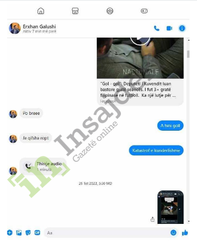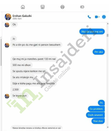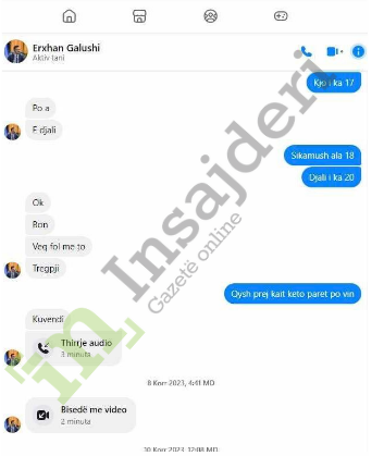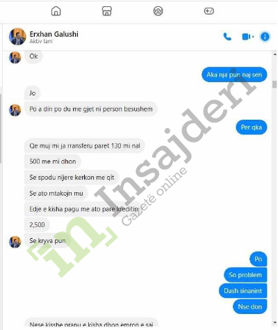 Në redaksinë e Gazetë Insajderi kanë arritur disa biseda të deputetit të Kuvendit të Kosovës, Erxhan Galushi me një mik të tij. Siç duket në këto fotografi, bëhet fjalë për ryshfet. Ndonëse, depueti ka mohur të ketë diçka të tillë. Ai tha se e gjithë biseda është shaka.