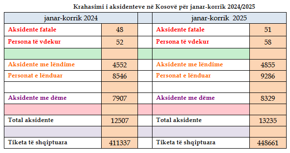 Gjatë 7 muajve të parë të vitit 2025 janë raportuar mbi 4 mijë aksidente, por me fatalitet ishin 51 sosh ku mbetën të vdekur 58 persona. Ndërsa në periudhën e njëjtë në vitin e kaluar kishin vdekur 52 persona në aksidente.