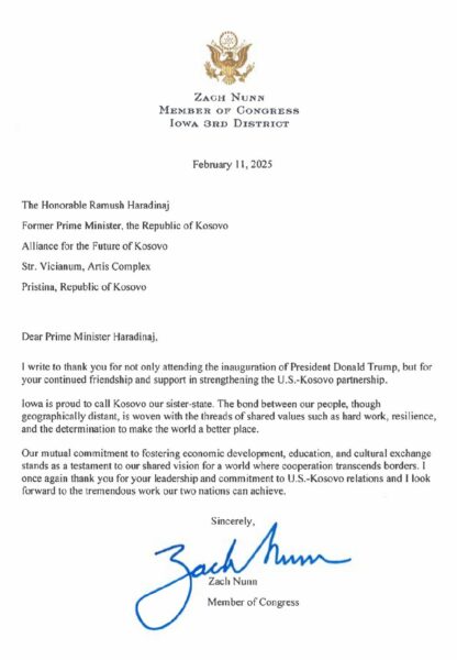 Kryetari i AAK-së, Ramush Haradinaj, ka publikuar një letër të kongresistit republikan, Zach Nunn, i cili ia dërgoi pas vizitës që Haradinaj pati në SHBA dhe që mori pjesë në inaugurimin e presidentit amerikan, Donald Trump.