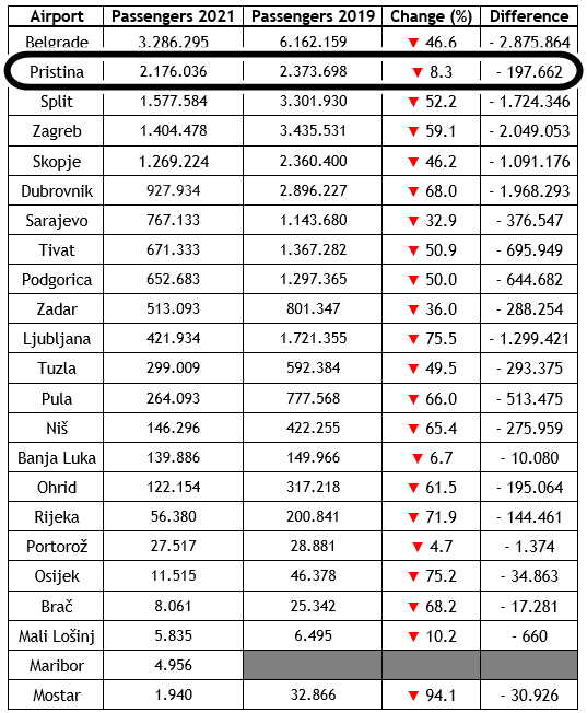 Aeroporti i Splitit, si i treti më i ngarkuar në ish-Jugosllavi, u rendit pak jashtë 100 top-ave në vendin e 103-të. Ajo u pasua nga Zagrebi, i cili u pozicionua në vendin e 112-të, ndërsa Shkupi ishte në vendin e 113-të. Dubrovniku ishte aeroporti i 129-të më i ngarkuar i Evropës, ndërsa Sarajeva i 132-ti. Aeroporti i Lubjanës, i cili ra jashtë dhjetëshes më të ngarkuar në ish-Jugosllavi në vitin 2021, ishte i 154-ti më i ngarkuar në Evropë, pak pas Aeroportit Sinop në Turqi dhe përpara Aeroportit Rennes në Francë. Siç është raportuar më parë, aeroportet në ish-Jugosllavi trajtuan një total të kombinuar prej pak më shumë se 14.8 milionë pasagjerë në vitin 2021, 97.3% më shumë se një vit më parë, por ende 49.7% në rënie në para-pandeminë 2019.