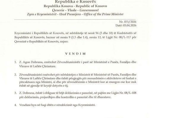 Kryeministri i Republikës së Kosovës Albin Kurti, ka emëruar Agon Dobrunën në pozitën e zëvendësministrit të parë në Ministrinë e Punës, Familjes dhe Vlerat e Luftës Çlirimtare.