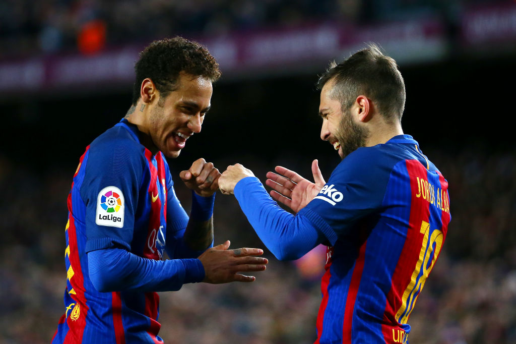Neymar dhe Alba duke e festuar një gol së bashku te Barcelona (Foto: Dan Istitene/Getty Images/Guliver)