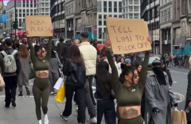 Në pamjet e publikuara, ajo shihet duke mbajtur pankarta në rrugët e njohura të kryeqytetit britanik.