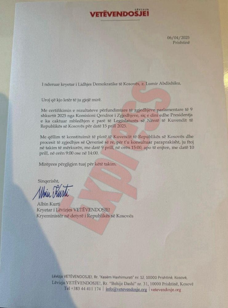 Kreu i Lëvizjes Vetëvendosje, Albin Kurti ia ka derguar një letër Kryetarit të Lidhjes Demokratike të Kosovës, Lumir Abdixhikut, me të cilën e fton për konsultime para konstitumit të paralamentit.