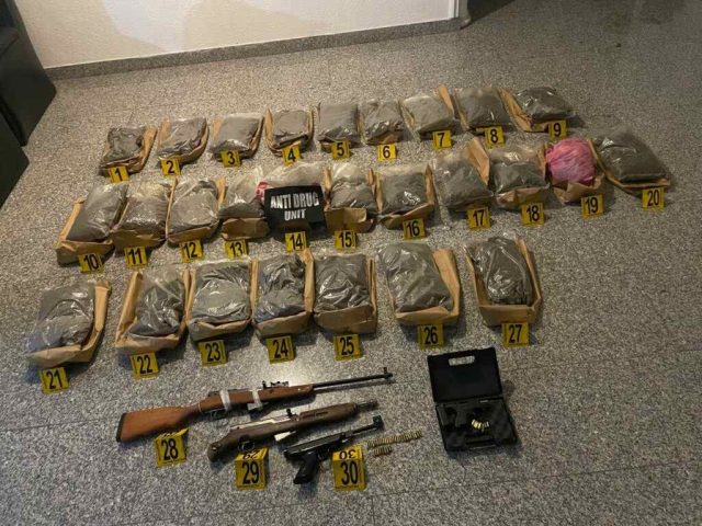 Gjatë kontrollit janë gjetur dhe sekuestruar: 27 paketime, dyshohet të jetë marihuanë me peshë 25 kg e 200 gr., një veturë, dy pushkë, dy revole, shtatë fishekë kalibrash të ndryshëm, gjashtë telefona celularë dhe 350 euro.