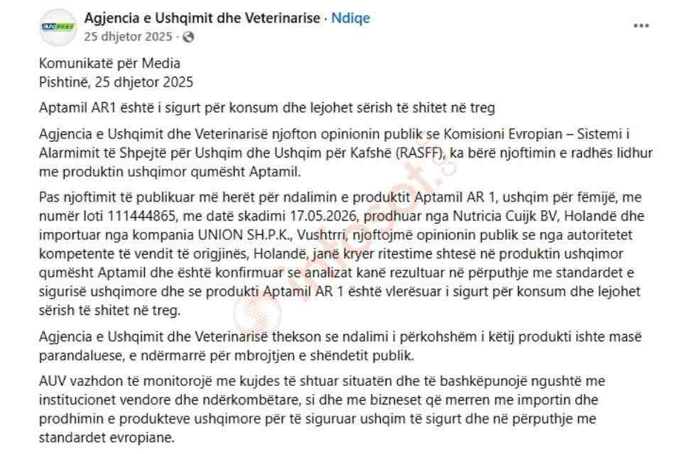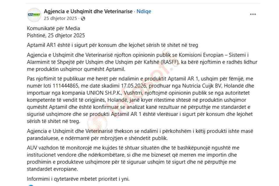 Në komunikatën për media të datës 25 dhjetor 2025, AUV bëri të ditur se, sipas njoftimit të Komisionit Evropian përmes Sistemit të Alarmimit të Shpejtë për Ushqim dhe Ushqim për Kafshë (RASFF), produkti Aptamil AR 1 ishte ritestuar nga autoritetet kompetente në Holandë dhe kishte rezultuar në përputhje me standardet e sigurisë ushqimore, por pa ofruar as edhe një dëshmi për këtë.