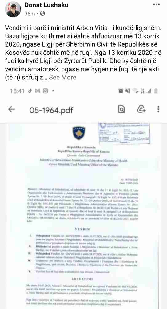 Donat Lushaku i cili është jurist me profesion dhe punon në Zyrën Ligjore të Lidhjes Demokratike të Kosovës shprehet se vendimi i parë i ministrit të Shëndetësisë Arben Vitia është i jashtëligjshëm.