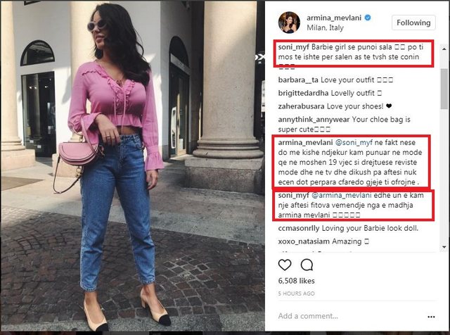 ‘Një Barbie në një botë Barbie-sh’, – ka shkruajtur nën diçiturën e fotos Armina duke kujtuar këngën e famshme të viteve ’90. Dhe pas ksaj vijnë komentet akusuese nisur nga lidhja e saj me djalin e ish kryeministrit Berisha, Shkëlzenin.