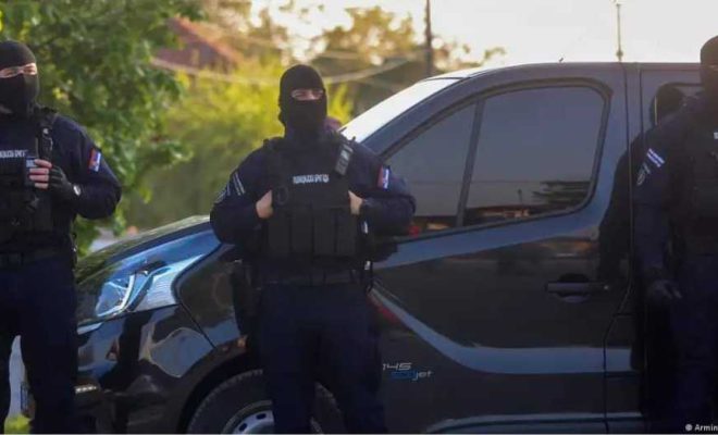 Fotografi e turbullot ku shihen siluetat e dy policëve të SerbisëFotografi e turbullot ku shihen siluetat e dy policëve të Serbisë