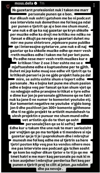 “Edhe kur u takum the une nuk te marr seriozisht per vrejtjen qe po ma terhjek e ti mendove si nje gazetar qe je ti je i paprekshum dhe i mbrojtur munesh me fol keq edhe me ul tjetrin sa here tjetri poston klip veq pse ka vendos nihere mos me pas interviste ose podcast gja tcilen sosht qe kom bo najher dikun tjeter e te ti jo qe me tmet hatri e me marr kaq personale po nuk ki m e kon asnjeher i mbrojtur perderisa flet keq per punen e tjetrit prej te cilit ai jeton ,pa ndalim dhe pa nevoje .”