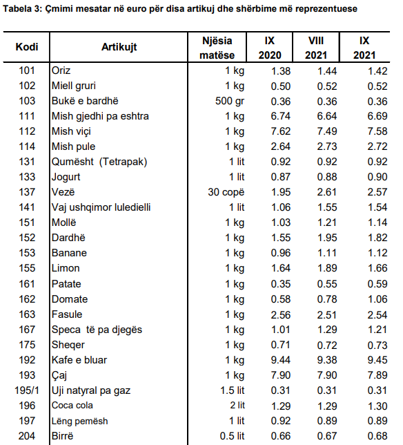 “Indeksi i tërësishëm i harmonizuar i çmimeve të konsumit është më i lartë në një mesatare prej 0.1% në muajin shtator 2021, krahasuar me muajin gusht 2021. Kjo kryesisht është shpjeguar me ngritjen e çmimeve të konsumit te nëngrupet e COICOP-it: mish (0.8%); qumësht, djathë dhe vezë (0.6%); perime (2.8%); ujë, pije joalkoolike, lëngje nga pemët dhe perimet (0.5%); lëndë djegëse të ngurta, dru zjarri, pelet etj. (1.3%); shërbime hoteliere (0.8%), me një ndikim të përbashkët të këtyre nëngrupeve prej 0.3 për qind në IHÇK. Ndërsa, rënie e çmimeve vërehet te nëngrupet e COICOP-it: pemë (-4.7%); shërbime për transport (-3.0%)-(rënie e çmimeve të biletave të transportit ajror), me një ndikim të përbashkët të këtyre nëngrupeve prej (-0.2 për qind) në IHÇK.”, thuhet në raportin e ASK-së.