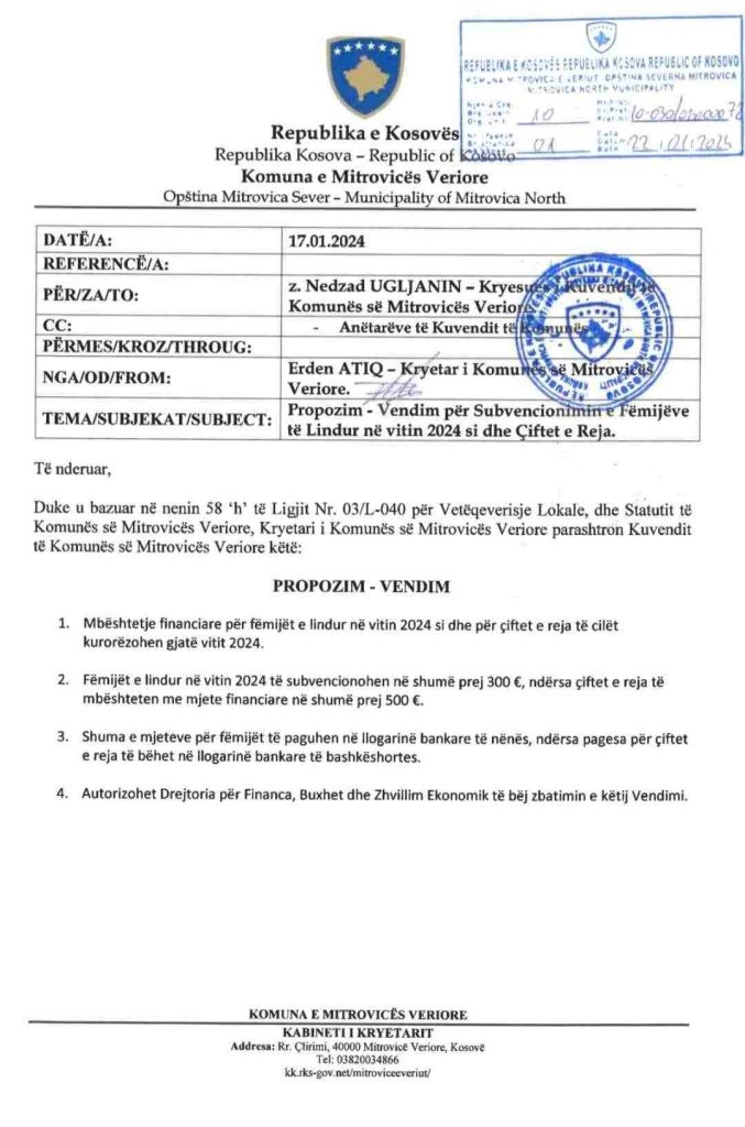 Kryetari i Komunës së Mitrovicës së Veriut, Erden Atiq, ka njoftuar se ka dërguar propozim-vendimin për ndarjen e 300 eurove për fëmijët e lindur më 2024 si dhe të 500 eurove për çiftet e reja.