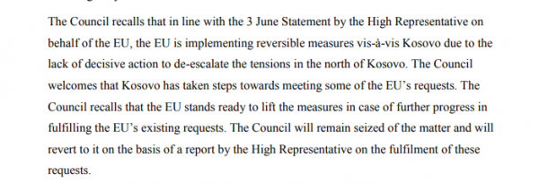 “Këshilli rikujton se në përputhje me deklaratën e 3 qershorit të Përfaqësuesit të Lartë në emër të BE-së, BE-ja po zbaton masa të kthyeshme ndaj Kosovës për shkak të mungesës së veprimeve vendimtare për të de-përshkallëzuar tensionet në veri të Kosovës. Këshilli mirëpret që Kosova ka ndërmarrë hapa drejt përmbushjes së disa prej kërkesave të BE-së. Këshilli rikujton se BE-ja është e gatshme të heqë masat në rast të përparimit të mëtejshëm në përmbushjen e kërkesave ekzistuese të BE-së. Këshilli do të mbetet i kapur për këtë çështje dhe do t’i rikthehet në bazë të një raporti të Përfaqësuesit të Lartë mbi përmbushjen e këtyre kërkesave”, thuhet në dokumentin zyrtar të publikuar në faqen e Këshillit të Bashkimit Evropian.