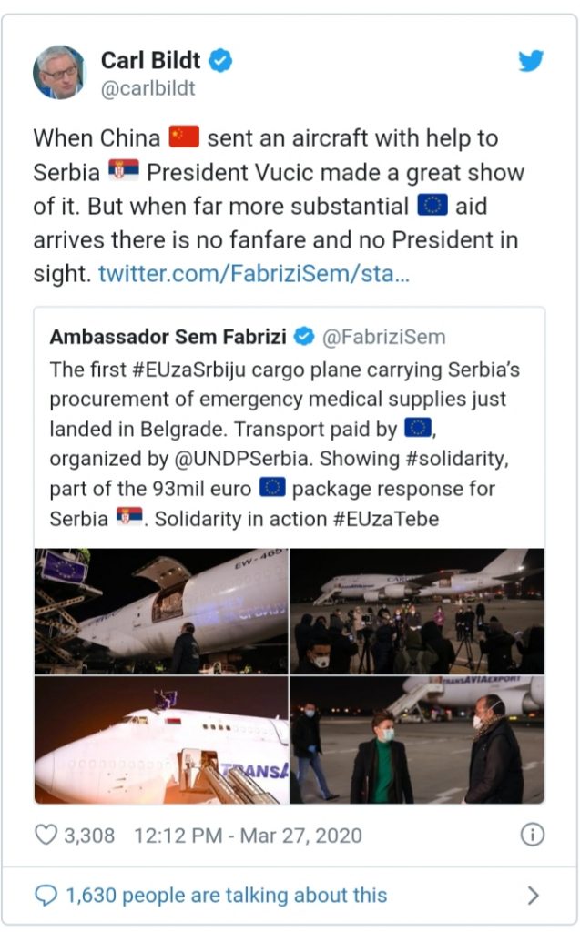 “Kur Kina dërgoi një aeroplan me ndihma në Serbi, presidenti (Aleksandar) Vuçiq bëri një spektakël të madh. Por kur arriti një ndihmë shumë më substanciale (nga BE), asnjë spektakël nuk kishte dhe as presidenti nuk ishte prezent”, ka shkruar Bildt.