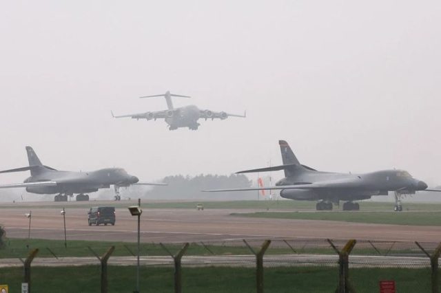 Një aeroplan mallrash Boeing C-17 ulet pas dy bombarduesve B-1 Lancer në imazhet më poshtë.