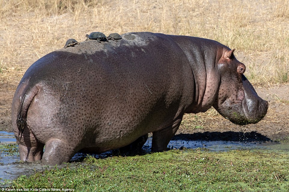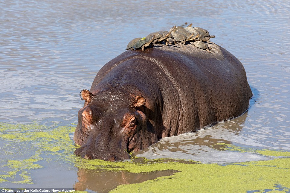 Hipopotamet konsiderohen si kafshët më të rrezikshme në Afrikë – por, kjo nuk i ka ndaluar afro 50 breshka, që t’i hipin në shpinë një kafshe të tillë dhe ta shfrytëzojnë si pushimore.
