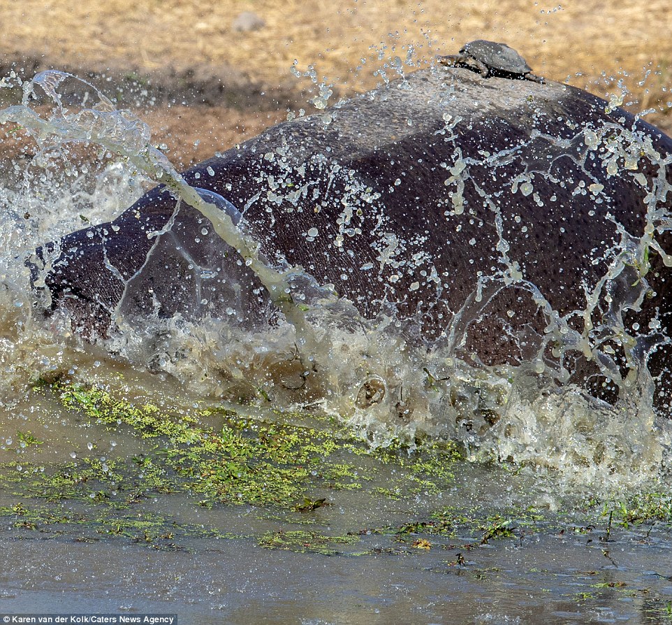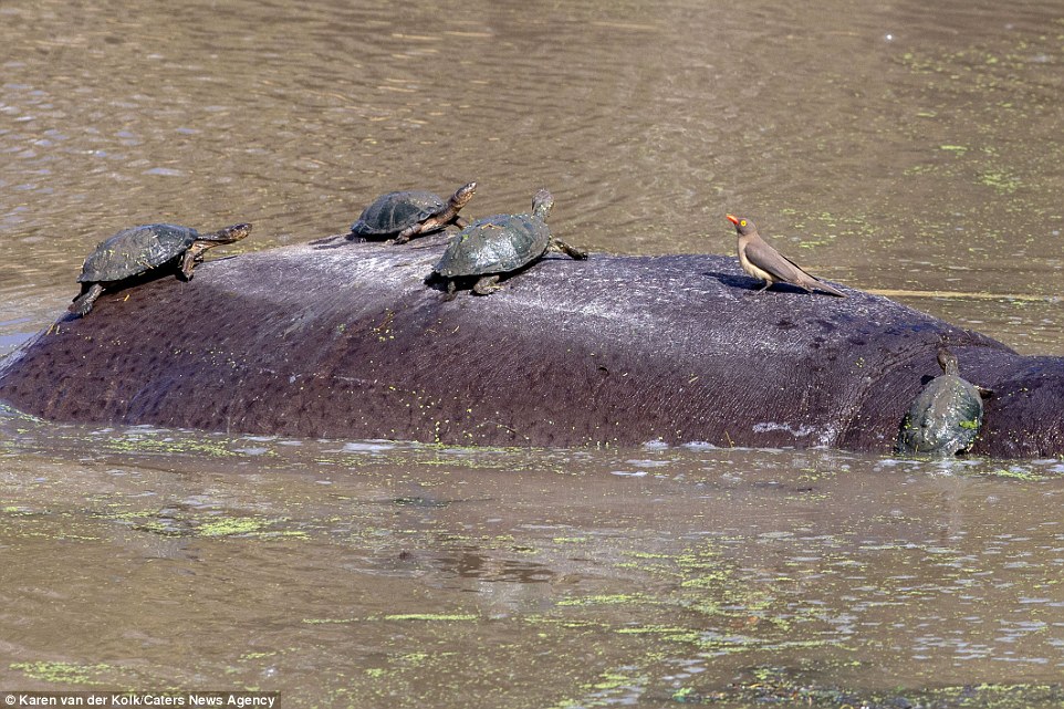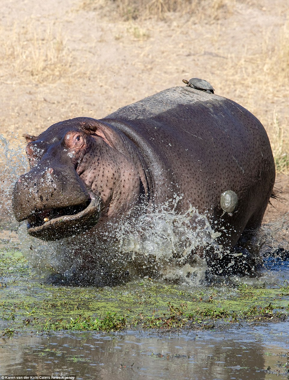 Breshkat që janë dashamirëse të natyrës, të cilat shfrytëzojnë gurët e ndryshme për të zënë rreze dielli, kësaj radhe shfrytëzuar shpinën masive të hipopotamit të ngrysur. Derisa ky i fundit, nuk doli në breg dhe i rrëzoi të gjitha për toke.