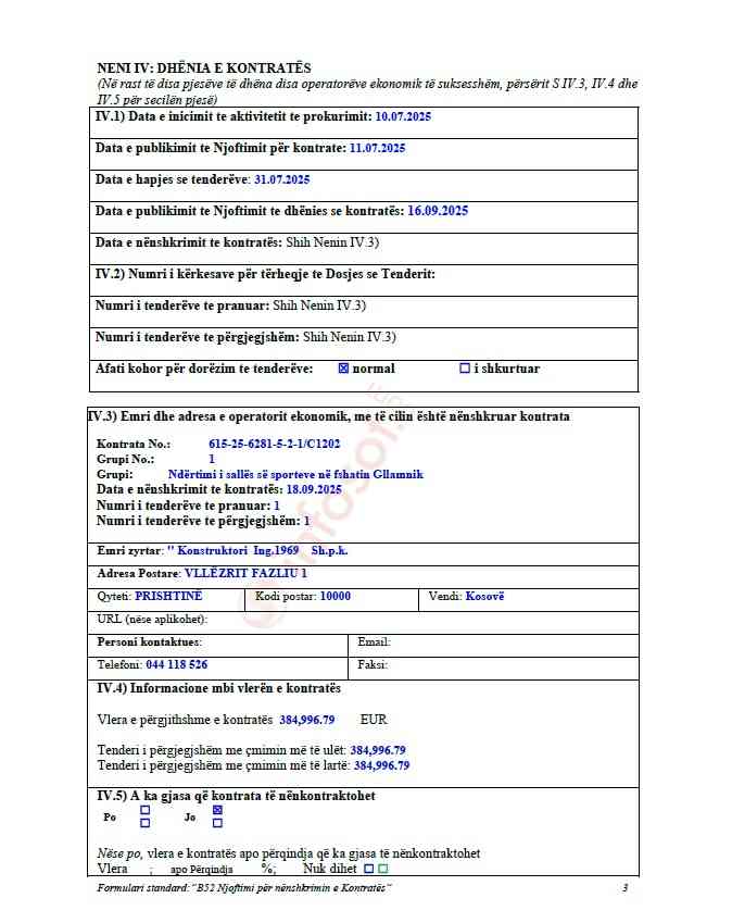 Fitues i këtij tenderi është kompania “Konstruktori Ing.1969 Sh.p.k”, me seli në Prishtinë.