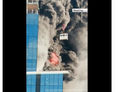 VIDEO/ Zjarr në një kantier ndërtimi në Britani, momenti kur punëtori tërhiqet nga vinçi dhe shpëton