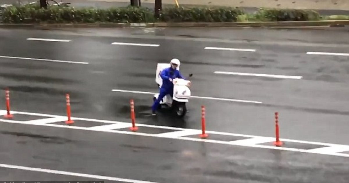 Erërat e fuqishme ia pamundësuan motoçiklistit t’i dërgonte picat te klienti (Video)