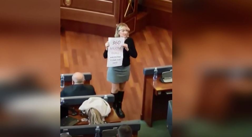 Matoshi me pankartë për opozitën n’Kuvend: “360 milionë euro askush nuk t’i falë – Kap voto”