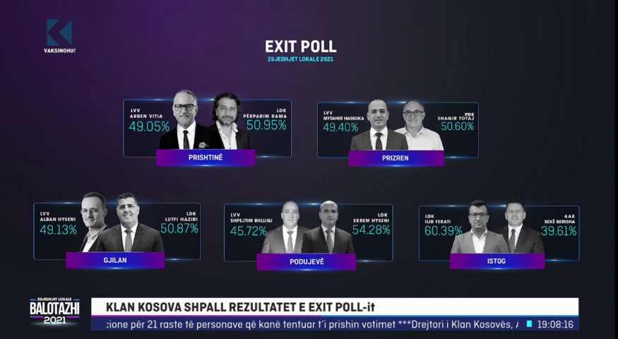 Nga pesë komunat e mëdha, LDK prin në 4 komuna, PDK në një, VV – asnjë, sipas EXIT POLL-it të Klan Kosovës