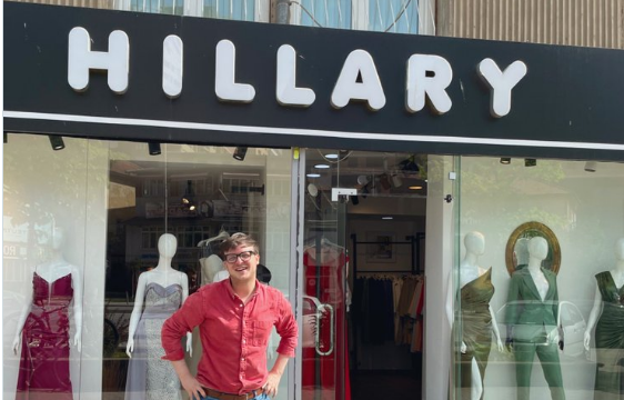 Gazetari amerikan pozon para një dyqani në Prishtinë që shet kopje të veshjeve të Hillary Clinton