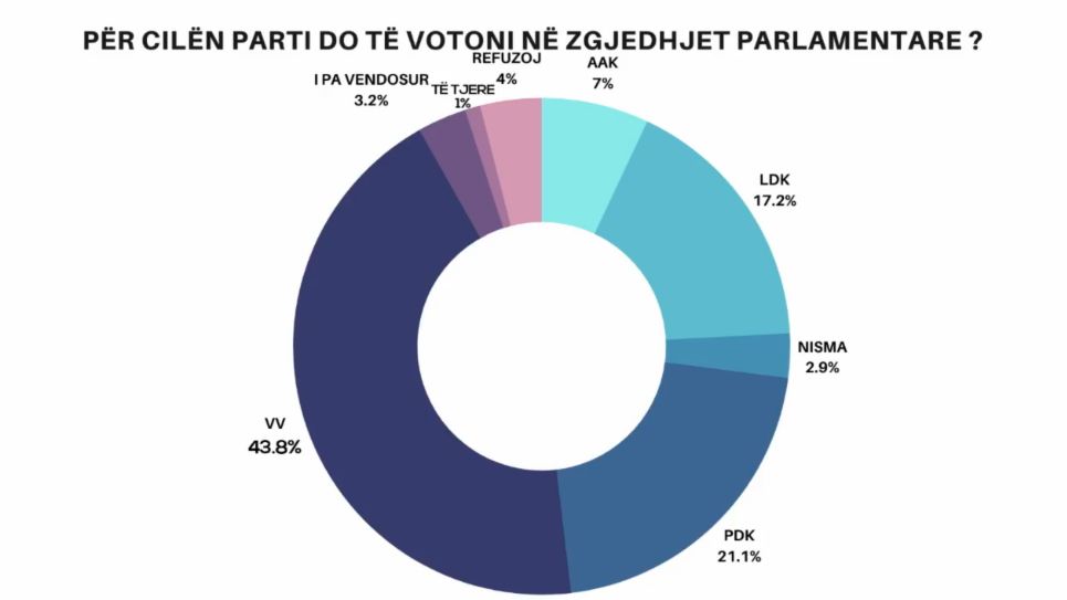 Sondazhi i ri i PIPOS: VV 43.8 %, PDK 21.1 %, LDK 17.2 %, AAK 7 %