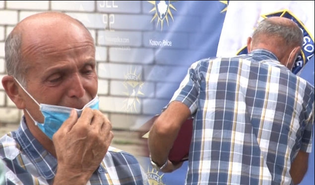 Babai i policit të vrarë, mes lotësh përqafon flamurin e Policisë së Kosovës