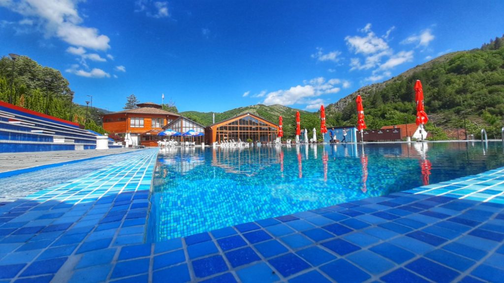 Ndërkaq, në hapësirë të hapur ka pishinë me ujë termal, pishinë, pishinë për fëmijë dhe ambiente përcjellëse, të cilat kanë kapacitetin e strehimit të 350 vizitorëve.