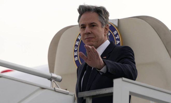 US Secretary of State Antony Blinken disembarks from the plane upon arriving at King Khalid International Airport, in Riyadh, Saudi Arabia, Monday, Feb. 5, 2024. (AP Photo/Mark Schiefelbein, Pool)