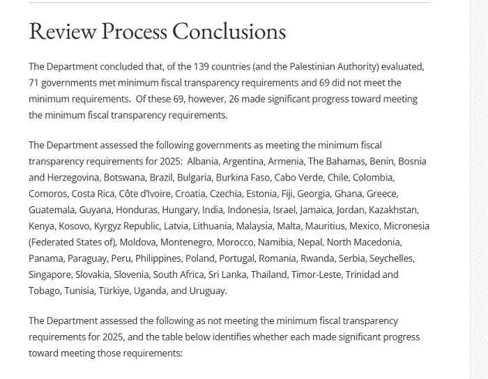 ‘‘Departamenti vlerësoi qeveritë e mëposhtme si qeveri që përmbushin kërkesat minimale të transparencës fiskale për vitin 2025: Shqipëria, Argjentina, Armenia, Bahamas, Benini, Bosnja dhe Hercegovina, Botsvana, Brazili, Bullgaria, Burkina Faso, Kepi i Gjelbër, Kili, Kolumbia, Komoret, Kosta Rika, Bregu i Fildishtë, Kroacia, Çekia, Estonia, Fixhi, Gjeorgjia, Gana, Greqia, Guatemala, Guajana, Hondurasi, Hungaria, India, Indonezia, Izraeli, Xhamajka, Jordania, Kazakistani, Kenia, Kosova, Republika e Kirgistanit, Letonia, Lituania, Malajzia, Malta, Mauritiusi, Meksika, Mikronezia (Shtetet e Federuara), Moldavia, Mali i Zi, Maroku, Namibia, Nepali, Maqedonia e Veriut, Panamaja, Paraguai, Peruja, Filipinet, Polonia, Portugalia, Rumania, Ruanda, Serbia, Sejshelet, Singapori, Sllovakia, Sllovenia, Afrika e Jugut, Sri Lanka, Tailanda, Timori Lindor, Trinidad dhe Tobago, Tunizia, Turqia, Uganda dhe Uruguai‘‘, thuhet në raport.