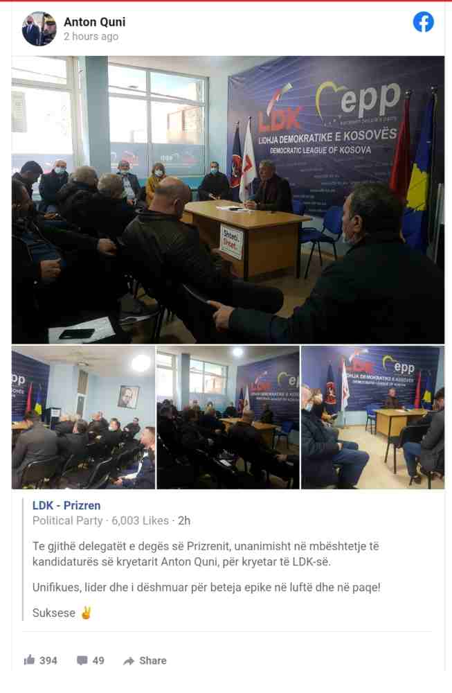 “Te gjithë delegatët e degës së Prizrenit, unanimisht në mbështetje të kandidaturës së kryetarit Anton Quni, për kryetar të LDK-së.