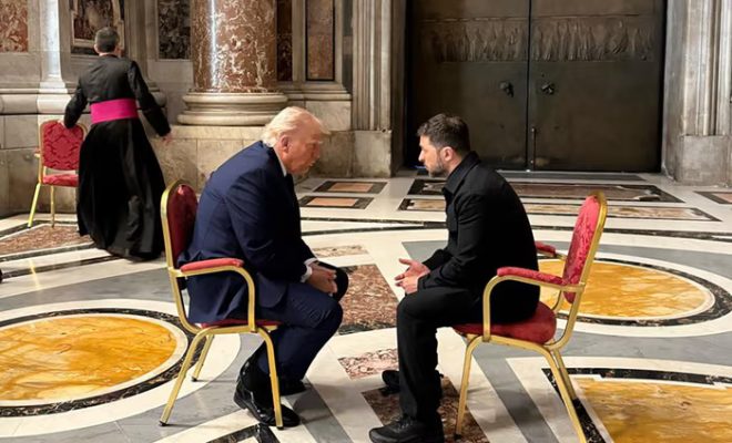 Del fotografia e parë e Zelensky-t duke u takuar me Trump brenda Bazilikës së Shën Pjetrit sot në Vatikan.
