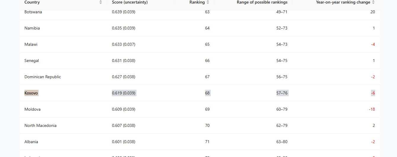 Në këtë raport të publikuar, tregohet që në tre prej treguesëve kyç për të cilët janë bërë matjet, Përfaqësimi, Sundimi i Ligjit dhe Pjesëmarrja, Kosova ka shënuar një rënie të ndjeshme, sidomos tek pjesa e Sundimit të Ligjit.