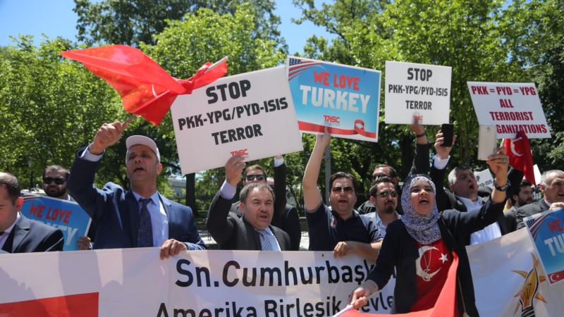 Video e konfrontimit, e regjistruar me kamera nga gazetari i Zërit të Amerikës, tregon se si persona që duket të jenë roje të sigurisë të Erdoganit shtyjnë dhe gjuajnë me shqelma protestuesit, disa prej të cilëve mbajnë në duar flamuj kurdë.